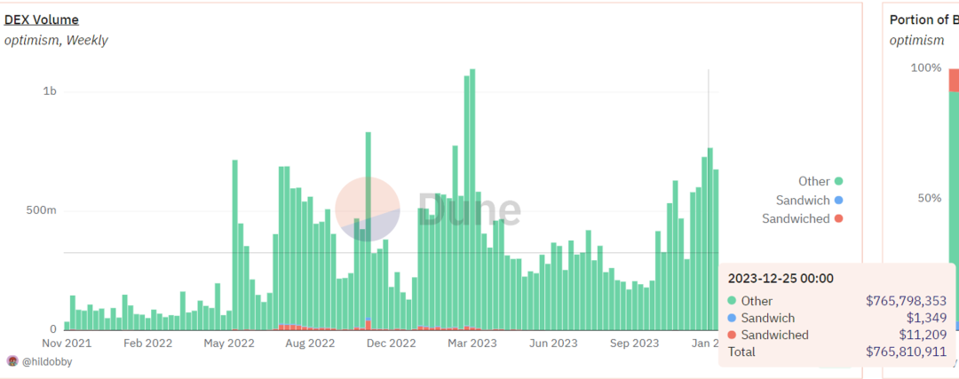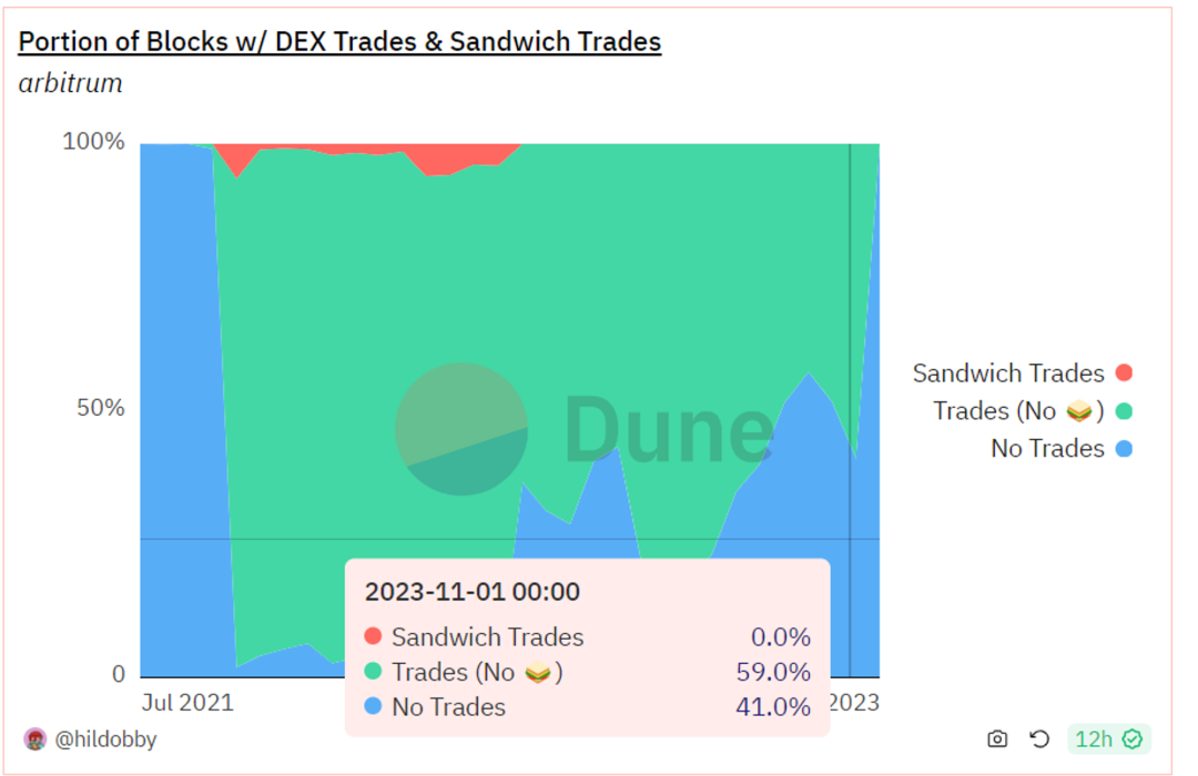 自2023年以来,Arbitrum区块交易中三明治攻击的比例已降至足够低的水平。在交易量方面,总交易量为数十亿美元,而涉及三明治攻击的交易量仅为数十万美元,也是非常小的。这可能跟ArbitrumFIFO的交易排序规则有关。