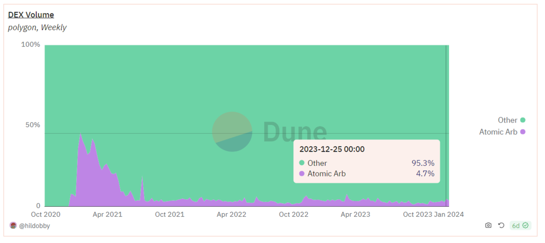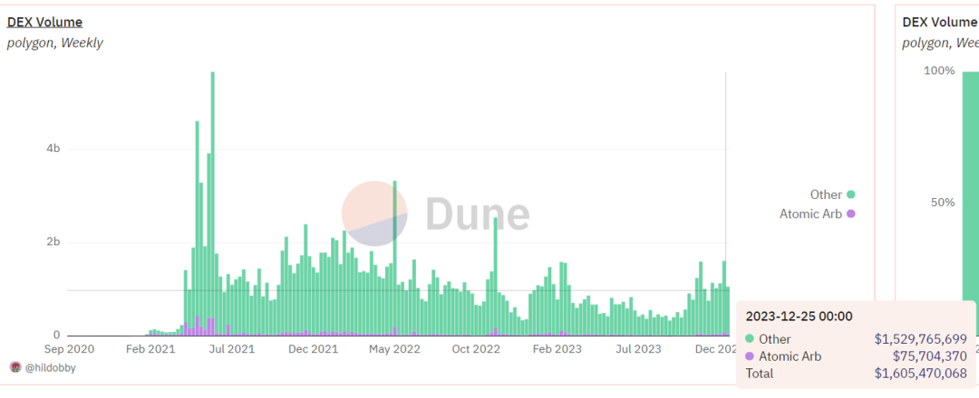 在Polygon网络上的套利交易占比更高,并且交易量显著大于三明治攻击。