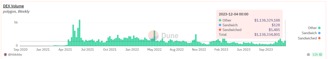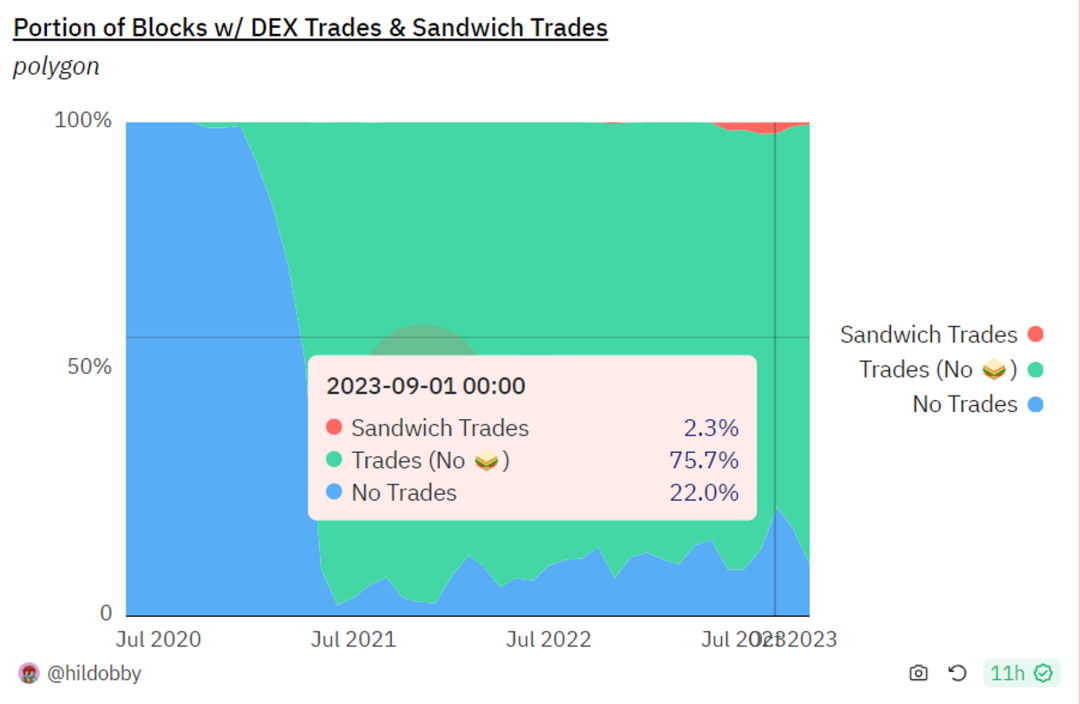 Polygon上的三明治攻击相对较少,大多数时间低于1%。在今年9月份,它达到了大约2.3%的峰值。基于交易量来看,受三明治攻击影响的交易量非常低。