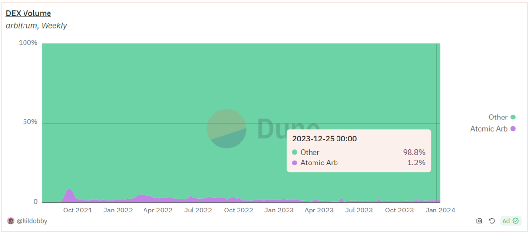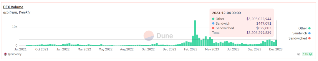 与其他链相比,Arbitrum上的套利交易比例相对较小。然而,与Arbitrum上的三明治交易相比,套利交易的交易量仍然要大得多。