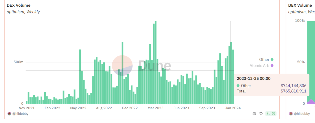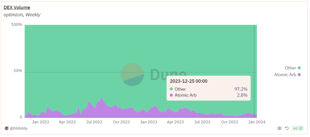 在Optimism上,套利交易的比例在2%到4%之间,与去年相比显示出下降趋势。套利交易的交易量相对较低。