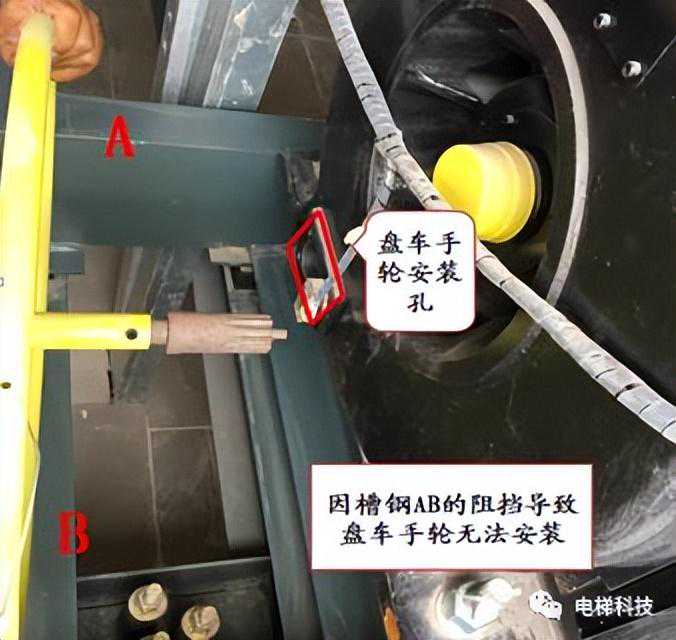 经向电梯制造单位了解出现这种情况的原因,是由于电梯整机制造单位采用外购的曳引机,曳引机制造单位为其产品配套专用的盘车手轮,但因电梯曳引机制造单位变更了该批次曳引机的设计,改变了盘车手轮的安装位置,而电梯整机制造单位没有及时核对相关参数并变更设计,就导致了曳引机基座阻碍盘车手轮安装的情况。