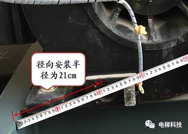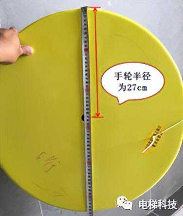 检验员通过对手动紧急操作装置即盘车手轮安装位置测量发现,由于曳引机基座的限制,可供盘车手轮安装的位置径向安装半径只有21cm(见图2),但配置的盘车手轮半径却有27cm(见图3)。