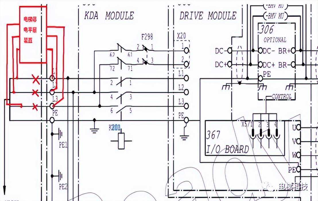 图1电梯应急平层装置串连接入电梯变频器的输入端(图中红色部分)