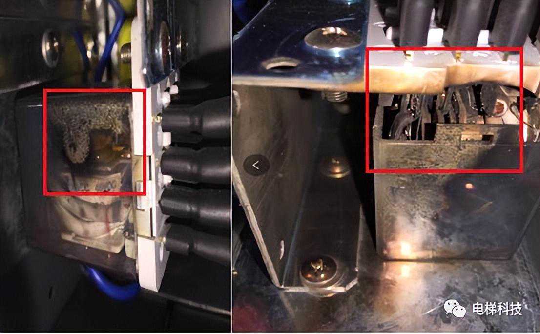 安装单位将电梯应急平层装置串连接入电梯变频器的输入端(见图1),相当于电梯应急平层装置给电梯变频器提供驱动主电源。电梯应急平层装置由继电器做主电源转换,其输出线径为6mm2(图2红色为输出线),而电梯专用电缆为20mm2。由于线径过小,电梯正常运行特别是在满载时由于线路过热,加之继电器设计容量不足,导致继电器烧熔(图3)后,电源输出端端子L1和L2贴粘在一起,短路产生的瞬时高电流致电梯变频器损坏,电梯停止运行,发生困人情况。