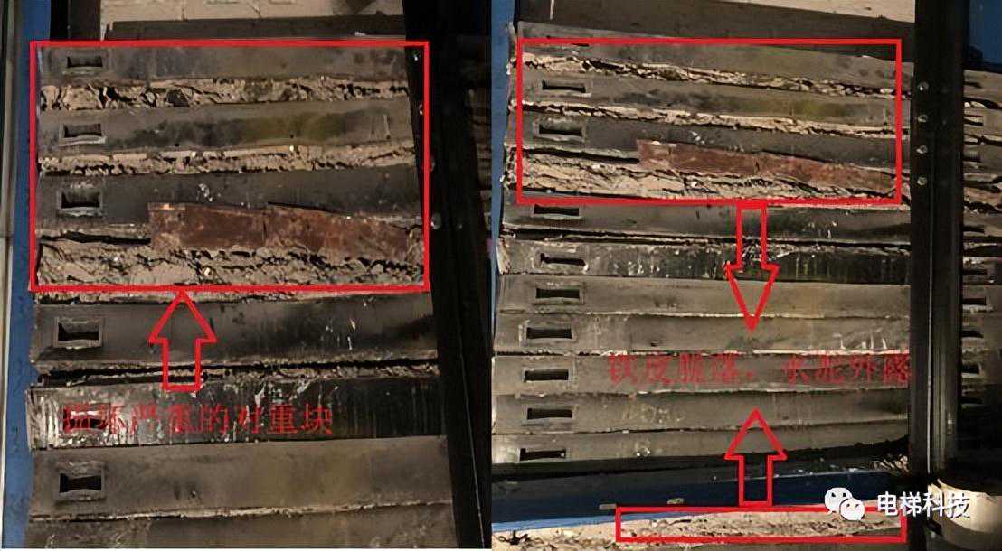 第一,使用环境影响。该台电梯井道内环境相对比较潮湿,造成对重块包裹铁皮锈蚀严重,部分严重变形并脱落;另外,高温潮湿的环境容易使水泥块产生热涨冷缩的变形,进一步加快了对重块的损坏。
