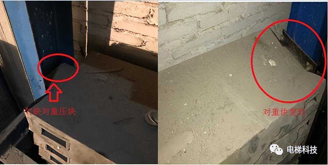 该电梯为曳引式载货电梯,现场对重架没有明显变形,但是对重块严重损坏,分析原因有以下两个: