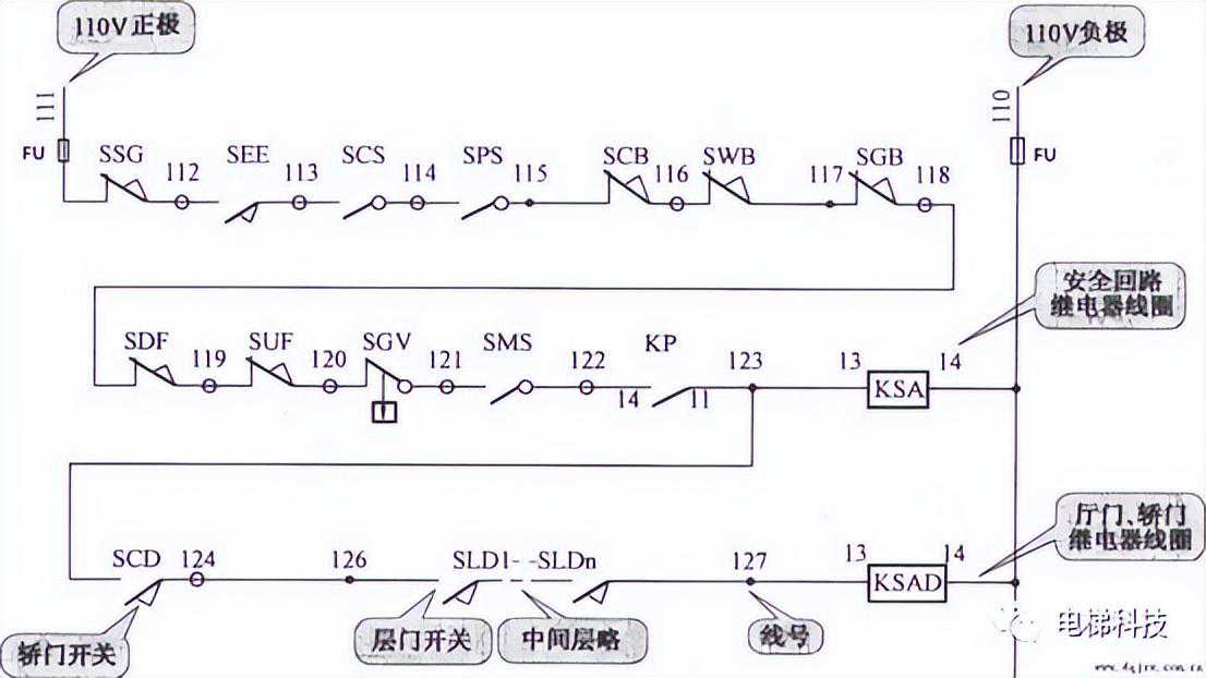 2、层门未做可靠接地可能造成门锁安全回路接地故障保护功能失效,常见的安全回路电气图如图2所示。