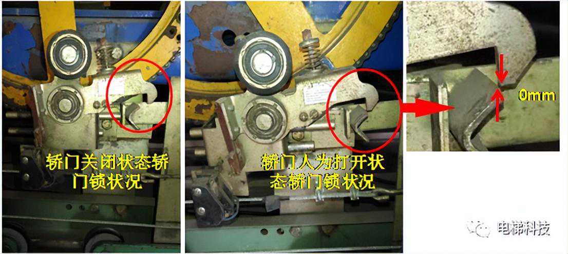 某特种设备检测院在对辖区内某使用单位的两台曳引驱动载货电梯进行定期检验时,发现其中一台电梯的轿门门锁装置失效。现场试验过程:人为打开轿门以验证门锁锁紧情况时,轿门能够被打开。经观察确认发现,轿门锁紧状态下其锁紧元件的啮合深度为0mm,详见图1所示。