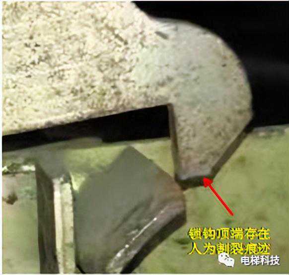 现场观察锁紧元件的锁钩顶端部分,锁钩顶端明显存在被人为割断的痕迹,如图2所示,割断是造成啮合深度不足的主要原因。从询问维保情况分析,电梯维护保养单位的日常维保工作不到位,是导致该问题遗留的根本原因。