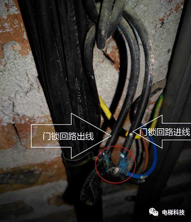 经检查,电梯控制柜安全回路线路接线正常。检查井道门锁回路线,发现5层层门门锁回路线接驳口处绝缘胶布已剥落(如图1),线路铜芯变形松散,并且铜芯上覆盖有水珠。人为干燥后,重新接驳并用绝缘胶布包裹(如图2),5层层门门锁回路恢复正常。由此分析问题原因:在高温潮湿的环境中,门锁回路接驳口处的绝缘胶布失去粘力,同时原线路接驳时有一定的弯曲。因此在失去绝缘胶布捆绑力后,在弯曲应力作用下,两根线路中松散裸露铜芯碰擦,再加上裸露铜芯表面水珠作为导电介质,最终形成回路,导致5层层门门锁回路失效。