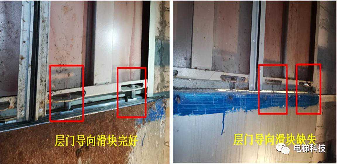 图1层门导向滑块完好状态(左图)/缺失情况(右图)