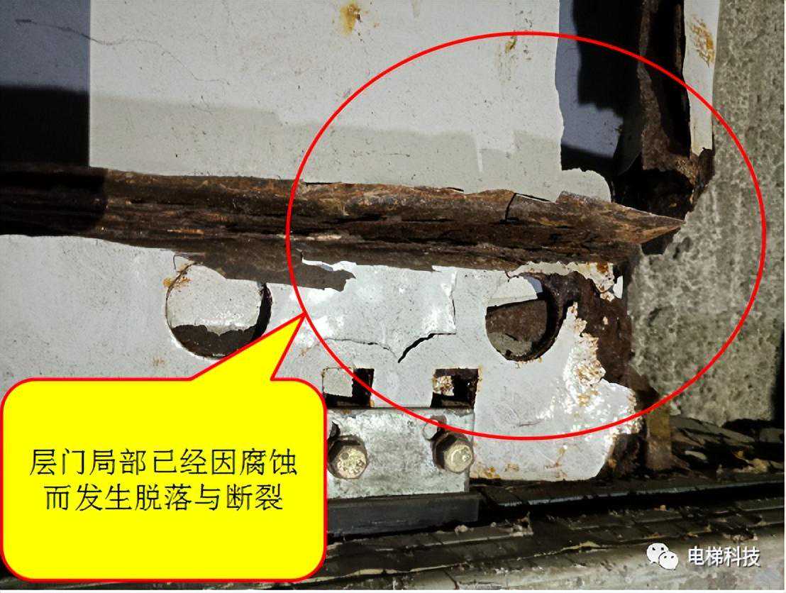 图3电梯层门局部因腐蚀出现脱落与断裂