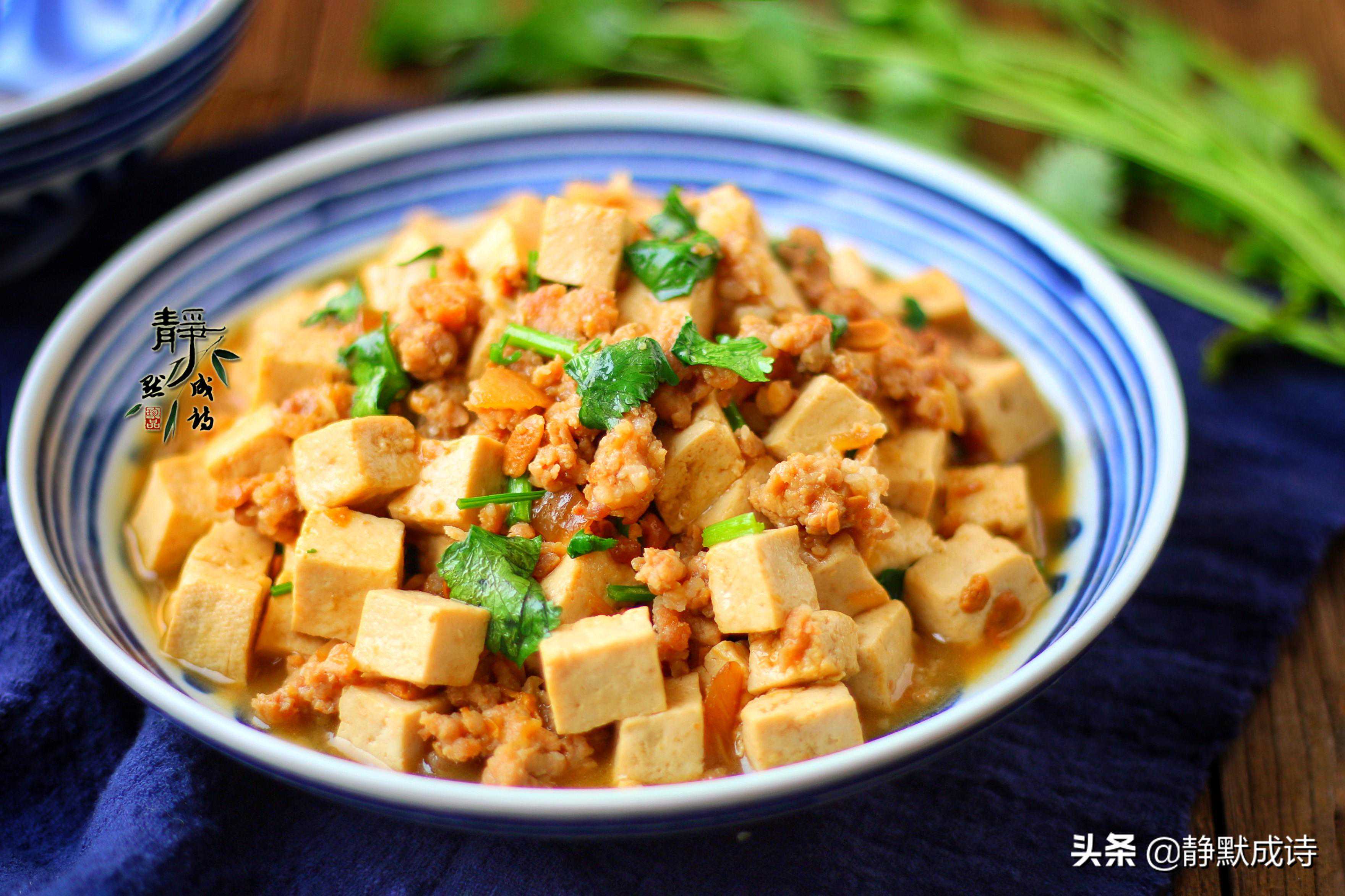 北豆腐切成将近1厘米左右的小块儿待用。猪肉末放在碗中,调入少许盐、酱油、淀粉,拌匀,再淋入少许油,继续拌匀后腌制几分钟。这道菜的调味料主要就是这个黄豆酱,酱香浓郁,取1大勺待用。热锅热油,炝香葱花,下腌制过的猪肉末翻炒至变色,加入黄豆酱,小火,不停地翻炒出香味儿。加入适量开水,把豆腐放进去,调入少许盐,用锅铲翻拌均匀,盖上锅盖,小火烧上几分钟。豆腐体积会稍稍变大,几分钟后,豆腐会入味儿,转大火收汁。汁不要收的太干,留下一些用来拌饭,出锅前撒入香菜碎来提味儿。