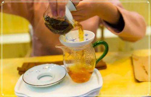 餐茶叶吸收了热水之后,变得橙黄绿色时候,便是倒茶(或称出汤)的时间点了。接着以一连串的动作,将剩余的热水倒入,盖上盖子,把茶汤分别倒入茶海或分茶器中。