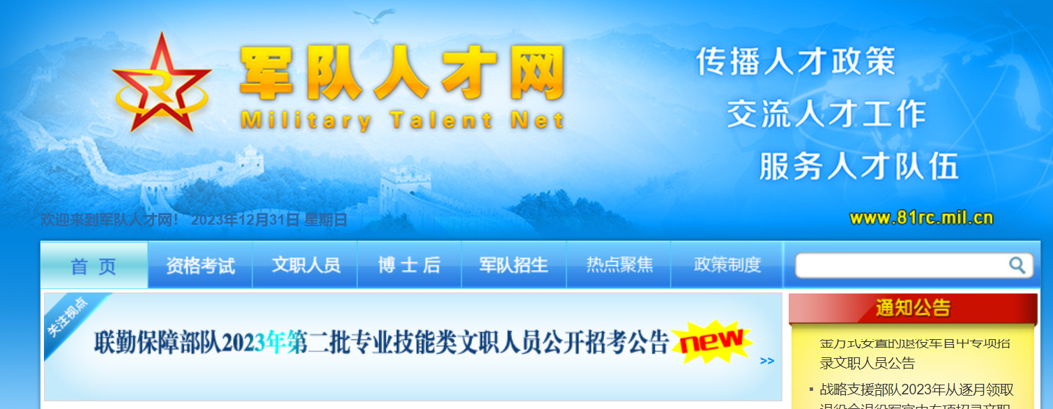 百度搜索时全称为“中国人民解放军专业技术人才网”,是军队文职发布招聘信息的唯一官方网站,如果对军队文职感兴趣,赶快上去看看吧!