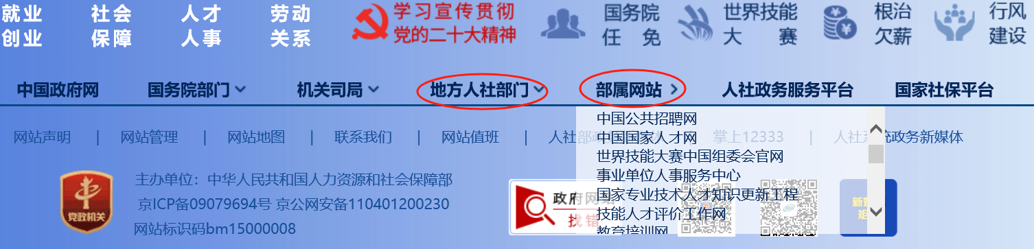在其底部的“地方人社部门”,可以直接链接各省的人社厅网站。在“部属网站”下有多个权威招聘人才网站,如:中国公共招聘网、中国国家人才网、中国人事考试网、中国就业等。