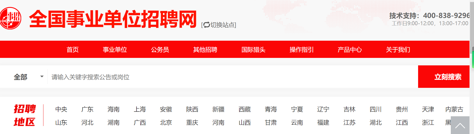 这个网站的信息很全,从中央到县区的招聘信息上面都有,还涉到大学老师、中小学老师招聘、医疗卫生系统招聘等各地事业单位的招聘。