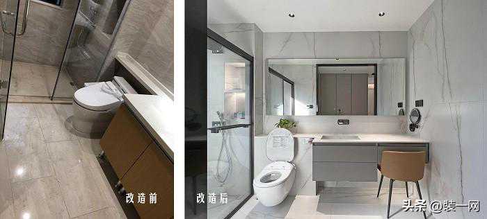 嵌入式水箱和悬挂式马桶,和洗面台相连,延伸了洗面台面积,让洗面台更加实用了。