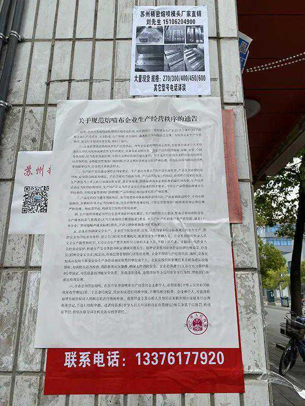 政府整治的布告上方,有商家“见缝插针”张贴了销售熔喷模头的广告。
