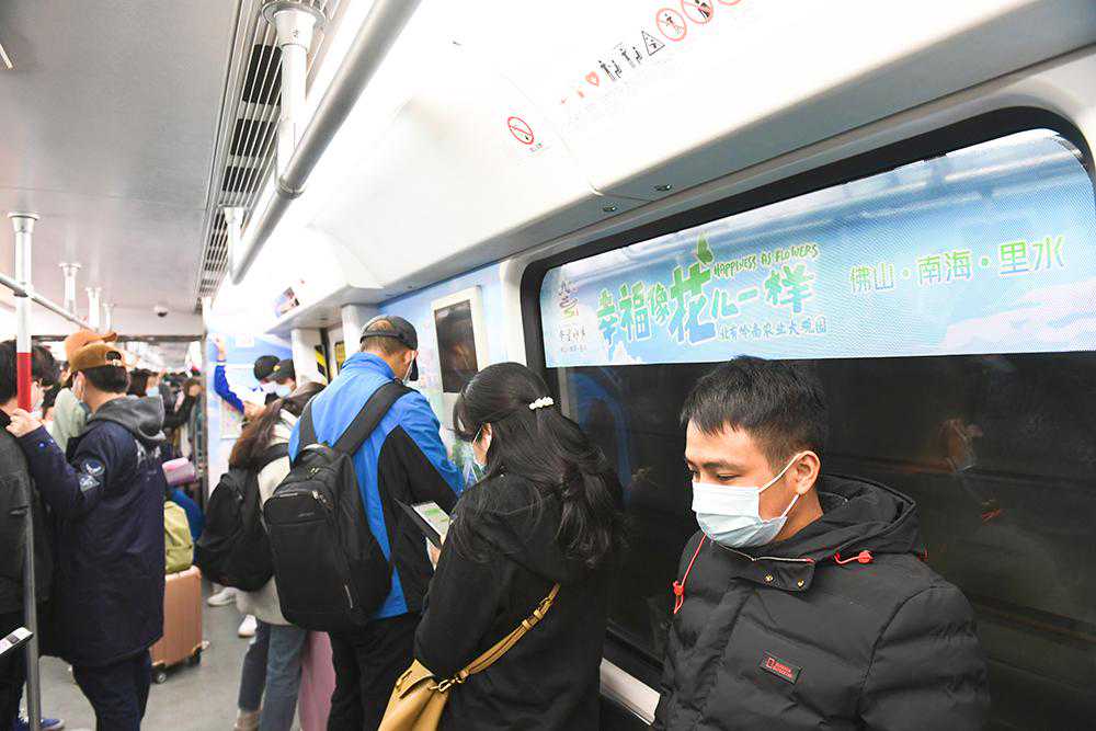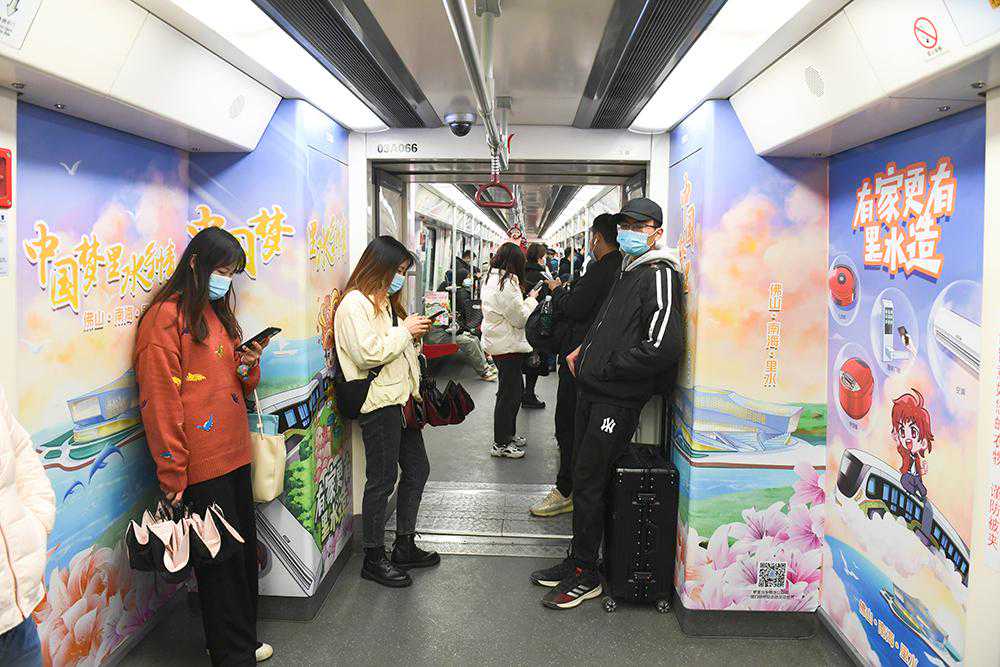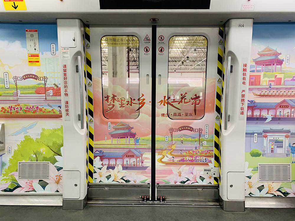 广州地铁3号线开启的“梦里水乡”专列以“中国梦里水乡情”为主题,6节车厢的看板、车门贴、车窗贴等位置,采用国潮风格的手绘作品,生动地展示了里水的非遗文化、吃货、玩耍、梦里水乡·百合飘香、梦里水乡·水上花市和中国梦等视觉形象,里水风情在广州精彩上演。记者在车厢里留意到,有“低头族”乘客也被这些令人眼前一亮的美景吸引,不时抬头观看。