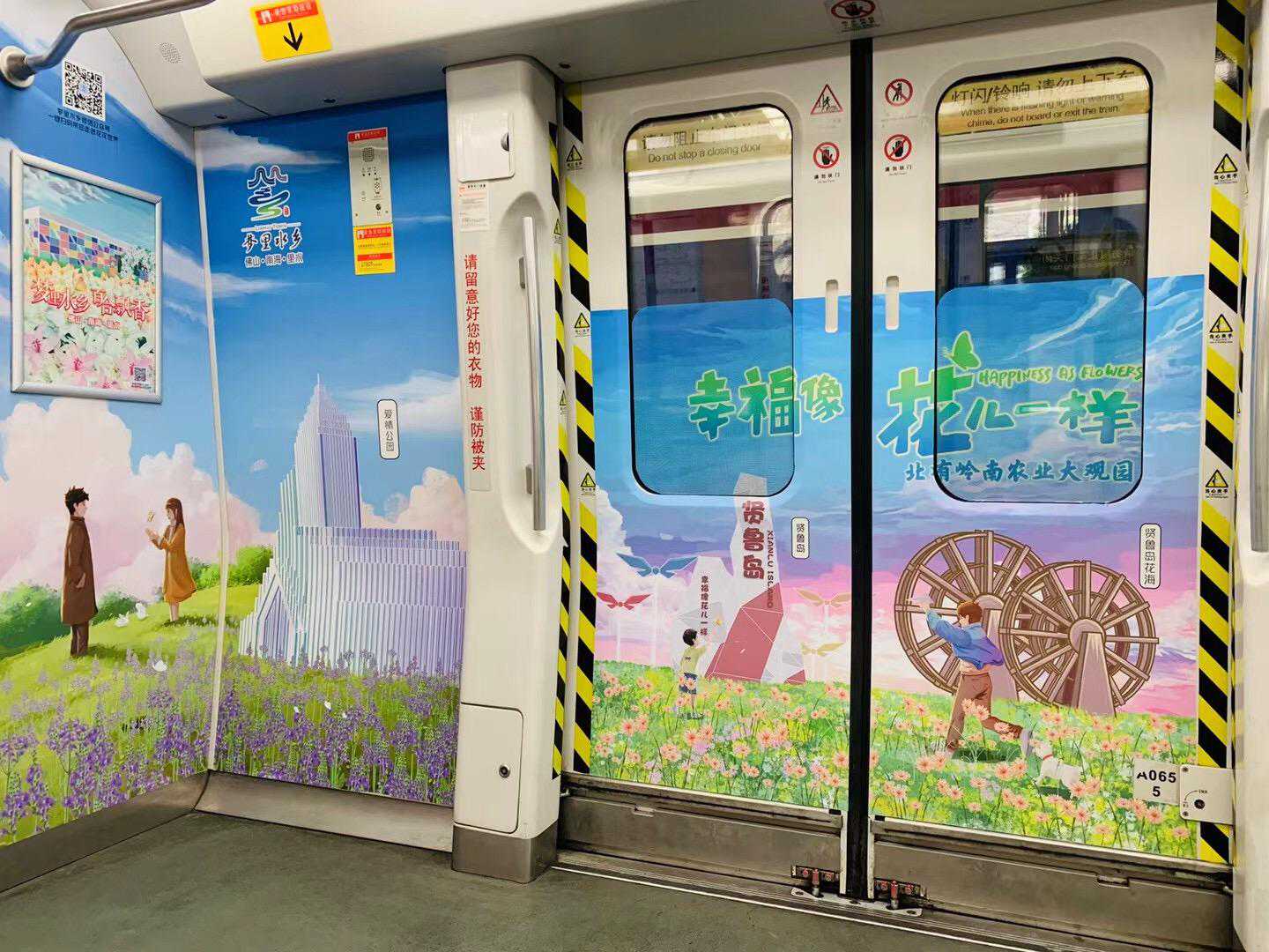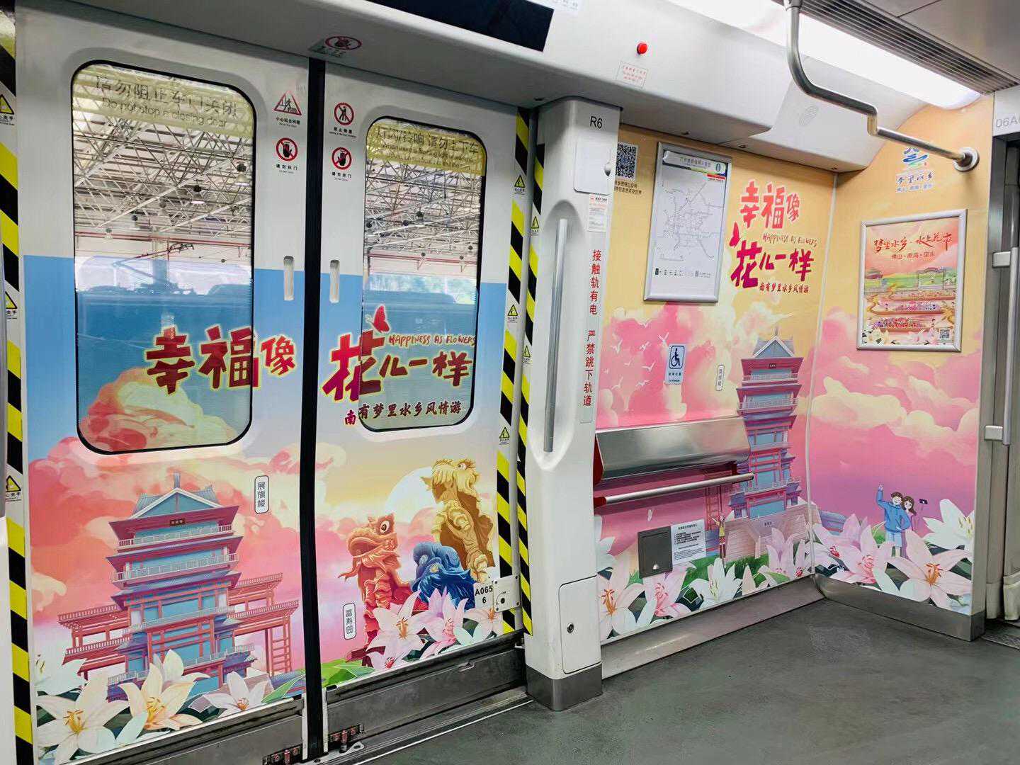 广州地铁6号线的“梦里水乡”专列将打造成一个文艺小清新的幸福打卡点,4节车厢以“幸福像花儿一样”为主题,用小清新的手绘风格描摹出“南有梦里水乡风情游、北有岭南农业大观园”两大连片乡村振兴精品示范线路。