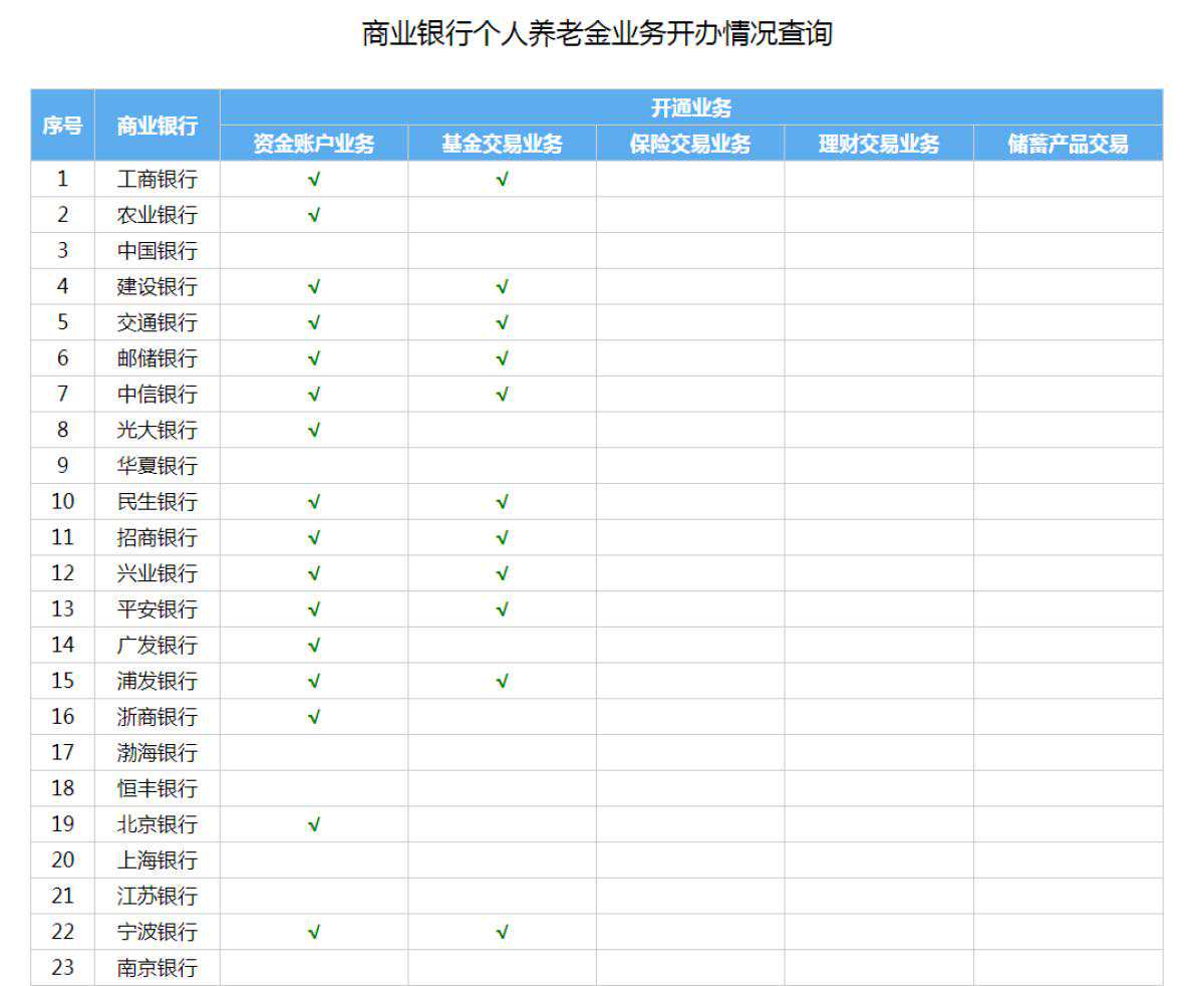 根据通知信息,首批23家入围个人养老金账户的银行上线账户开通服务,符合条件的个人(参加基本养老保险的劳动者,不含退休人员)均可通过这些银行开设账户。这23家开立银行包括:6家国有银行、12家股份制银行,以及北京银行、上海银行、江苏银行、宁波银行、南京银行等5家城商行。