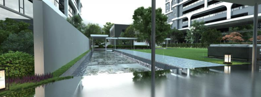 从世界著名的“海洋之心蓝钻”形态提取灵感,在G3中间打造无边泳池,天境水幕从休闲廊架落下,泳池整体抬升地面,营造仿无边际的效果。