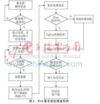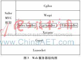 Copas模块完成TcpSocket的调度工作,负责接收请求、建立连接,并监视Socket套接字的状态变化,当监听到有数据后,交给Xavante模块处理。Xavante模块将接收到的数据包进行解析,得到包头信息,并根据解析出来的Url请求使用不同的处理函数进行处理,包括Index页面处理函数、文件处理函数以及Cgi处理函数。Cgi处理函数调用Cgilua模块进行处理。处理完毕后将处理结果交给Wsapi模块,它将抽象的Lua语句转换为规范的html语句。最后Xavante模块将处理结果加上包头信息发送给客户端。其中,Web页面的组织方式使用SailorMVC框架。具体处理流程如图4所示。