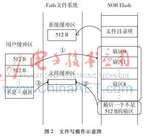 如图2所示,写一个文件时会将这个文件分成两部分:整扇区和最后不足一个扇区的部分。整扇区的写操作是由用户缓冲区直接写入物理磁盘,最后不足一扇区的部分,先从磁盘读取相应扇区的内容到文件缓冲区,修改缓冲区内容,并设置回写标记,最终在调用文件关闭函数或再一次写文件时,再将文件缓冲区的内容回写到物理磁盘中。这样就一共调用了两次磁盘写函数,磁盘写函数调用SPI写函数,而每次调用SPI写函数时都会根据写入数据的长度擦除所在的整个簇。如果文件缓冲区写入的扇区和之前已经写好的整扇区在一个簇内,则第二次调用SPI写函数时会再一次把整个簇擦掉,因此之前写入的整扇区内容也被擦掉了。为了避免这种情况,在SPI写函数中加了一个判断,在擦之前判断擦除的地址是否是一个簇的起始地址,如果是则进行擦除操作,否则直接写入。