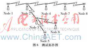 使用本方法在QiLINK链状网其中一个节点(使用TMS320C6670芯片开发)上进行测试,测试拓扑图如图6所示。所有节点的默认IP为192.168.1.3,入网后的IP为10.9.,其中X为节点号乘以9,比如节点4的IP为10.9.36.2。