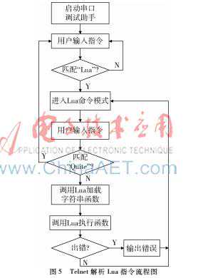 NDK协议栈提供的Telnet服务的用户指令包含多个关键字,它们被存放在大小为10的字符指针数组tok中,各命令需要匹配多少个关键字,就从tok数组中依次取出相应的元素进行匹配。Lua命令只需输入“Lua”一个关键字,因此将tok[0]指向的字符串和“Lua”比较,如果相同,则进入Lua命令输入模式(即调用Lua解释器),等待用户输入Lua指令,以回车键作为一次输入的截止标志。Lua解释器将输入的字符串作为一段Lua代码载入并编译,然后作为一个代码块(称为chunk)压入栈中。此后,调用Lua的异常处理函数去执行这个代码块。图5为Telnet解析Lua指令流程图。
