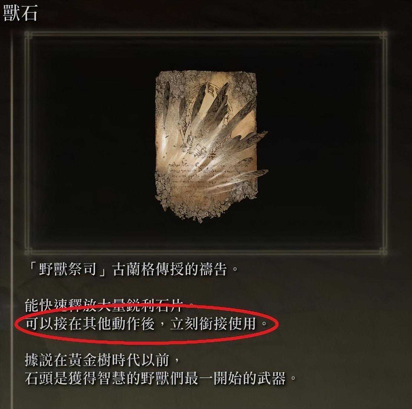 只要说明上面写着,可以"连续使用"或"可以接在其他动作后使用"的祷告,都可以互相衔接,例如"兽石"的特征是FP消耗最低、施展最快,"精准雷击",起手慢;但是连续施放快,因此可以先放兽石后再衔接"精准雷击",这样就可以快速的进行连续施放。