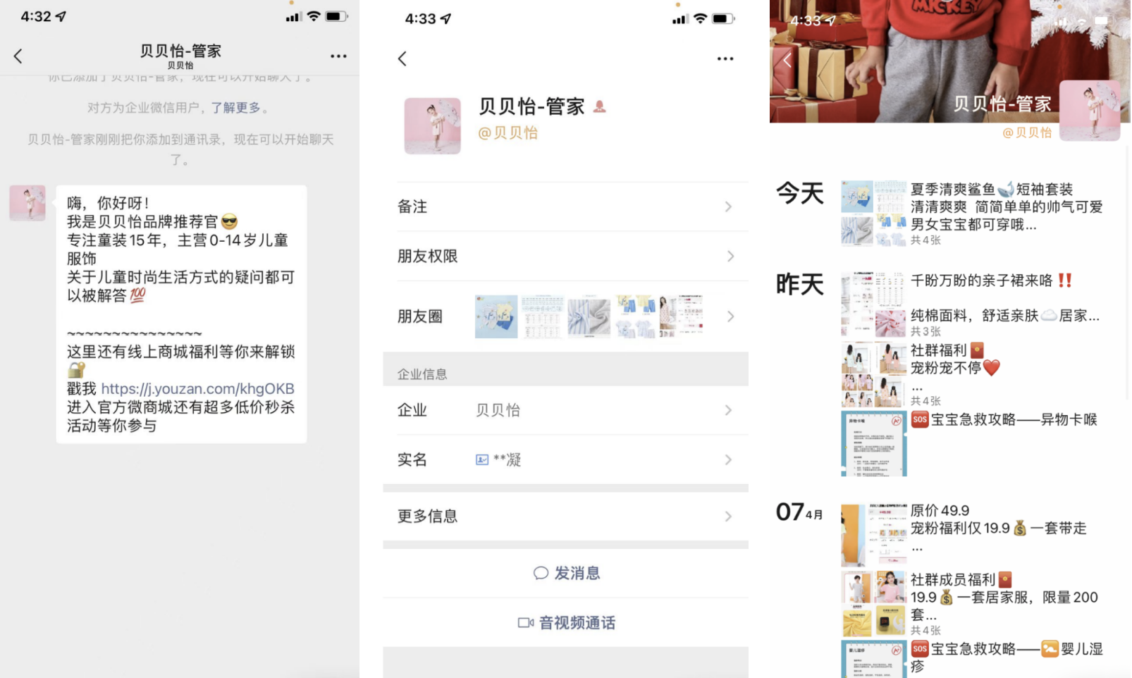 贝贝怡的员工微信采用统一的前缀“贝贝怡-xxx”,例如贝贝怡-小鲸鱼、贝贝怡-福利官。