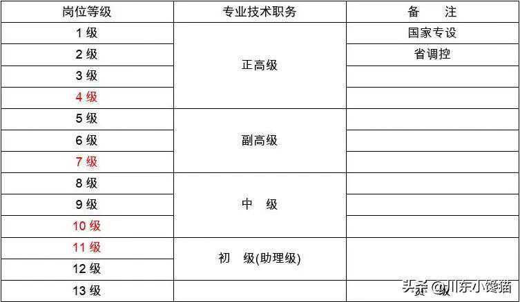 事业单位中的专业技术岗位级别(职称)通常分为高级、中级、初级和员级、具体划分为13个等级,正高级职称包括1—4级,副高级职称包括5—7级,中级职称包括8—10级,初级职称包括11级—12级、13级为员级。