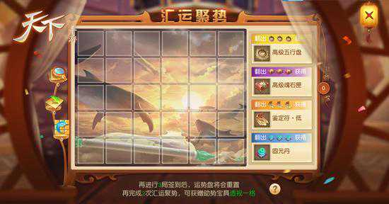 “汇运聚势”零门槛参与,只要少侠每天上线签到,即可参与一局,每天晚上0点刷新。想要知道今日运势如何,翻翻吉运格心里就有数!运程越佳即可用越少的次数翻出犀利的奖励道具。玩法类似翻翻乐,玩家只要翻出3个一样的图型,就可以获得对应道具,好礼触手可及。运势盘分天、地、玄、黄四种等阶,每个等阶都藏有鸿运大奖,高级五行盘、混石匣、鉴定符、固元丹、金币等应有尽有。