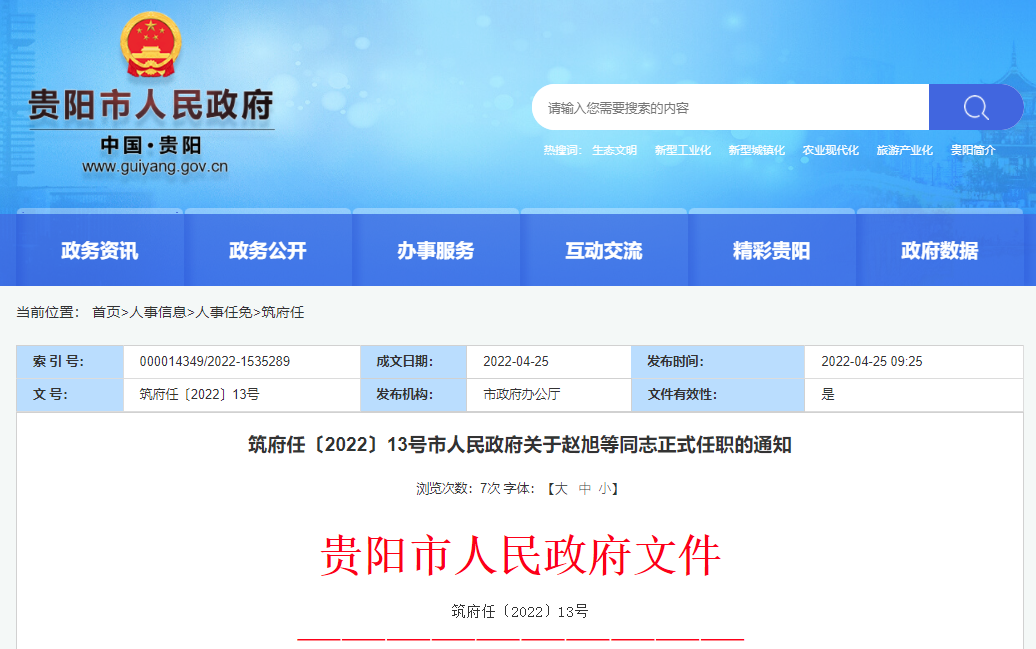 赵旭同志正式任贵阳市人民政府副秘书长,任职时间从2021年4月起计算;