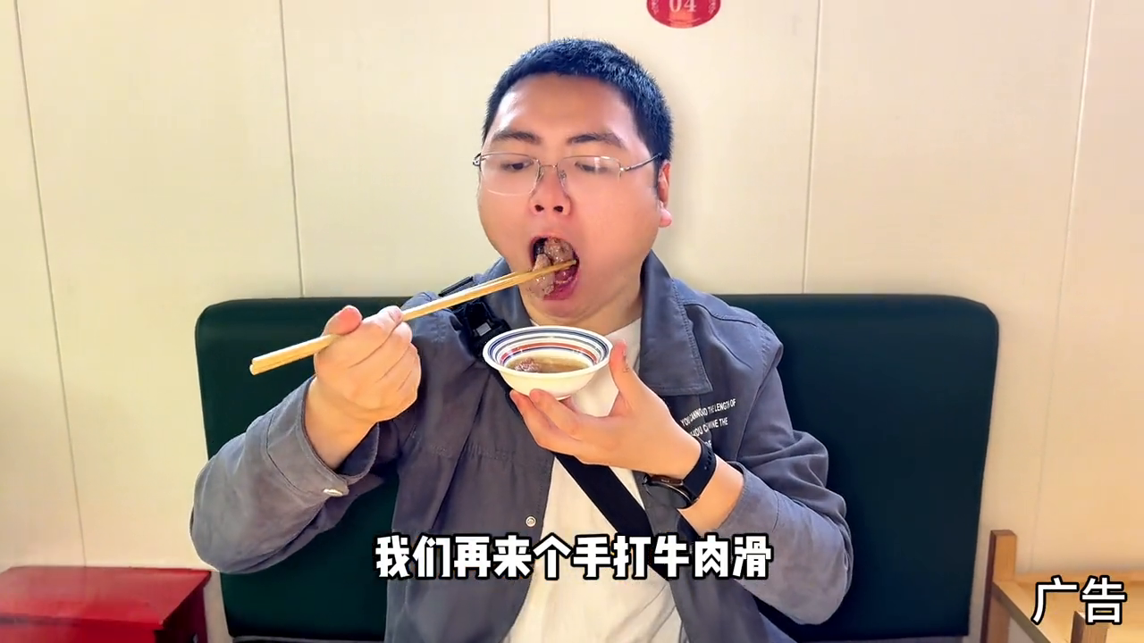 在他们家吃要先喝牛骨高汤,一定要记住撒点葱花喝一口,非常的鲜。牛骨汤喝起来很养胃,来一口牛肉,看一下,牛骨汤煮的牛肉很舒服,特别喝它的汤的时候再来个手打牛肉滑。