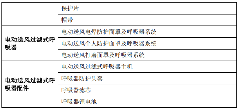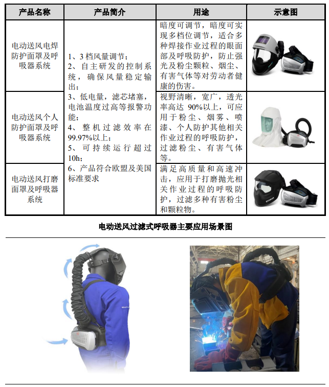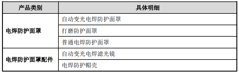 公司主要产品包括电焊防护面罩、电动送风过滤式呼吸器及相关配件,具体明细分类如下: