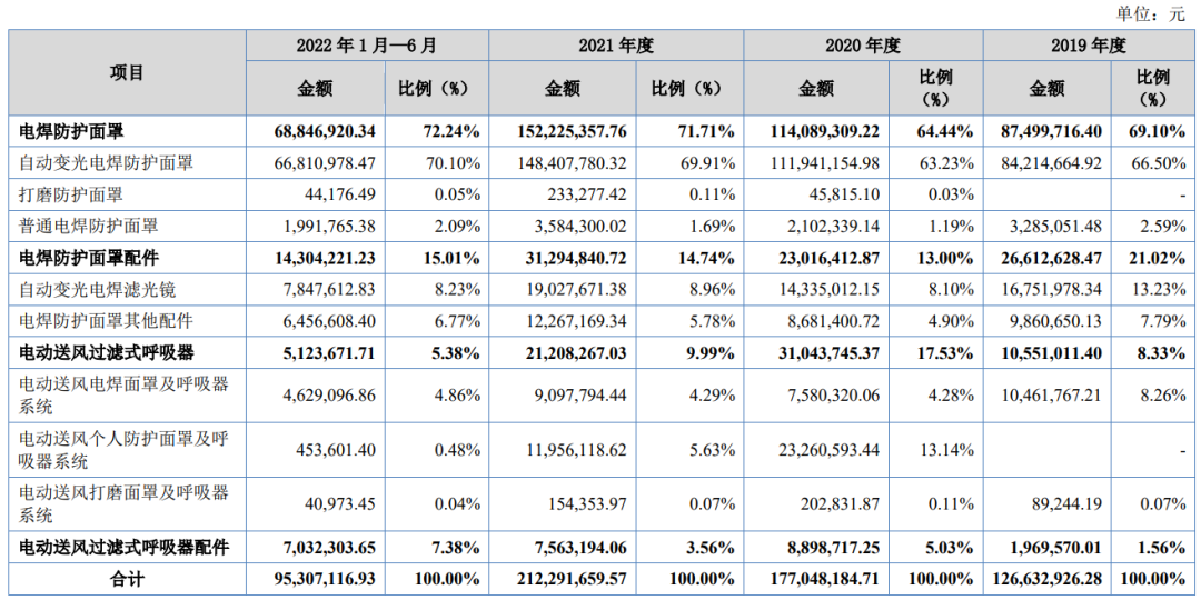 主营业务收入为电焊防护面罩,营收占比超过70%,其次是电焊防护面罩配件。