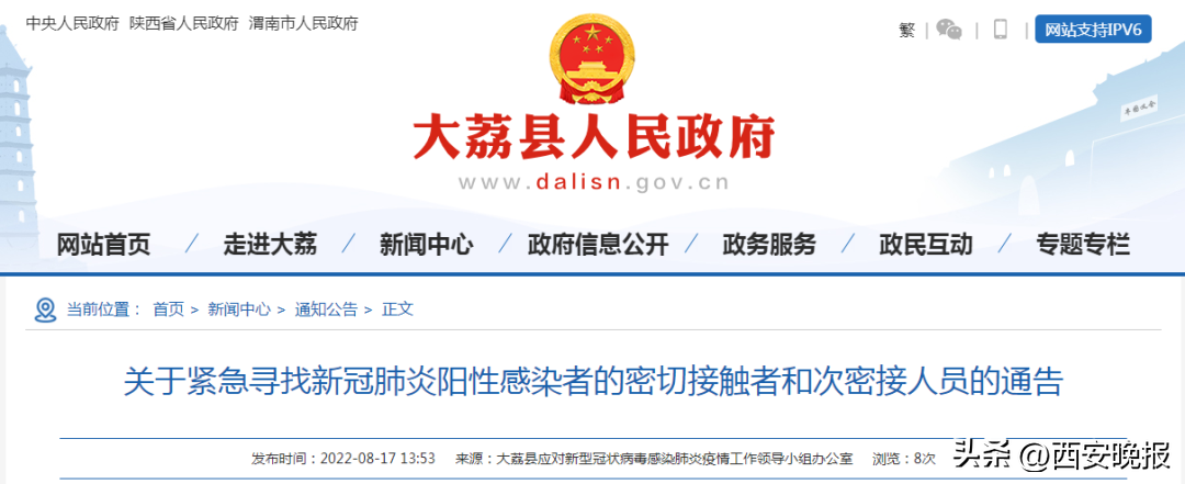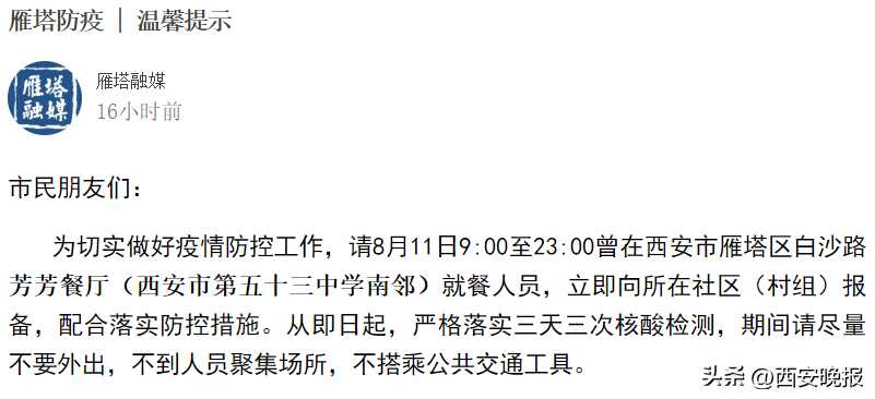 据雁塔融媒消息,为切实做好疫情防控工作,请8月11日9:00至23:00曾在西安市雁塔区白沙路芳芳餐厅(西安市第五十三中学南邻)就餐人员,立即向所在社区(村组)报备,配合落实防控措施。从即日起,严格落实三天三次核酸检测,期间请尽量不要外出,不到人员聚集场所,不搭乘公共交通工具。
