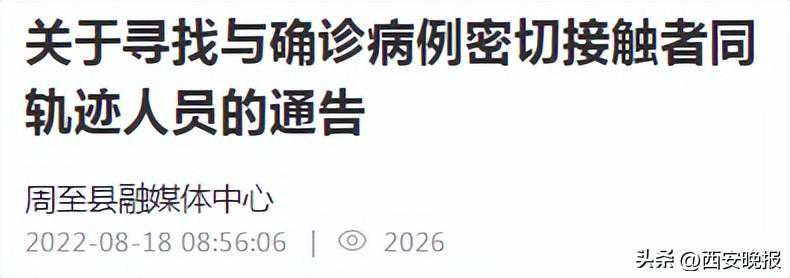 2022年8月17日,接报有一确诊病例密切接触者于8月13日在周至县水街烟火巷子有活动轨迹,为保证广大群众的身体健康,请8月13日20:44以后进入烟火巷子中东-02-台湾鸡翅包饭、20:46以后进入烟火巷子中东-07-虾想手打虾滑、20:46以后进入中东-06-重庆龙记山城汤圆和21:18以后进入B内-06-茶颜悦色的人员立即主动向所在社区(村)、单位报备,并落实个人健康监测和三天两次核酸等措施。对8月13日20:00-21:30有水街烟火巷子活动轨迹的居民,落实村镇报备、健康监测和一次核酸等措施。