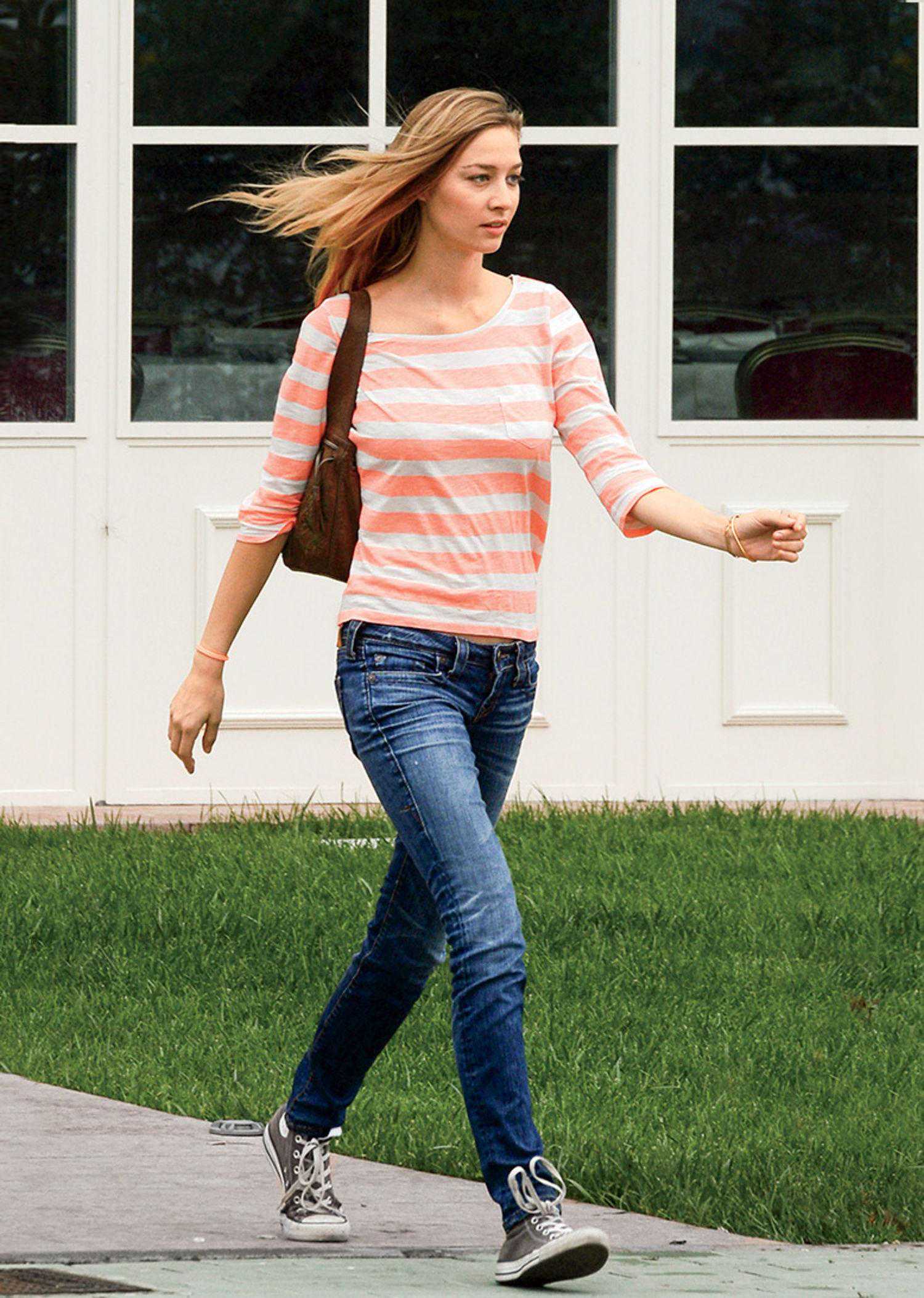 橙红色条纹上衣,配上牛仔裤、平底帆布鞋,任由长发飘扬空中,这身打扮着实很接地气了。