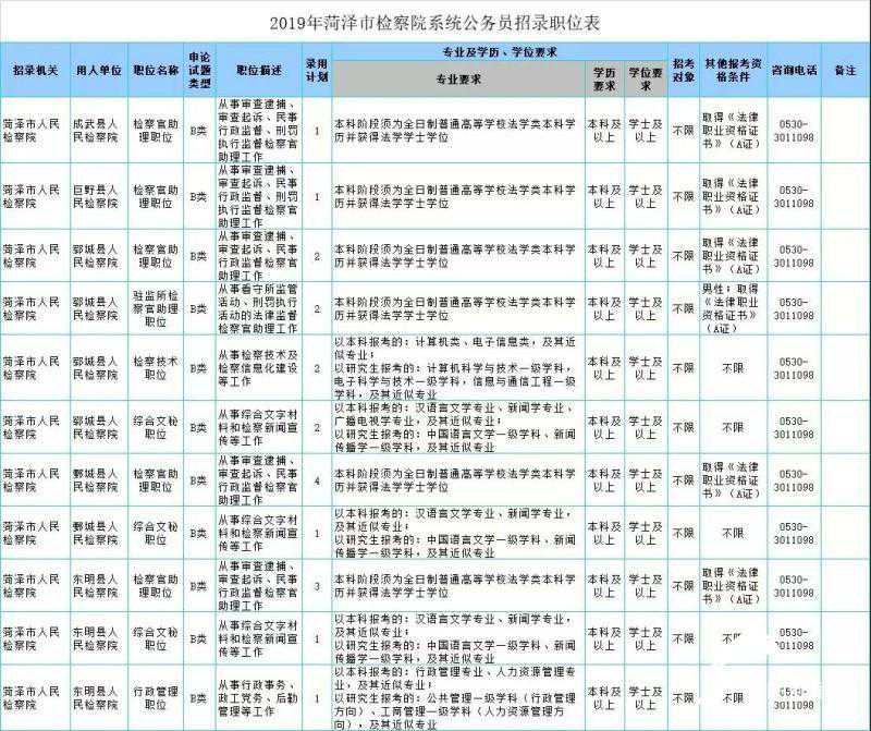 附:2019年菏泽市检察院系统公务员招录职位表