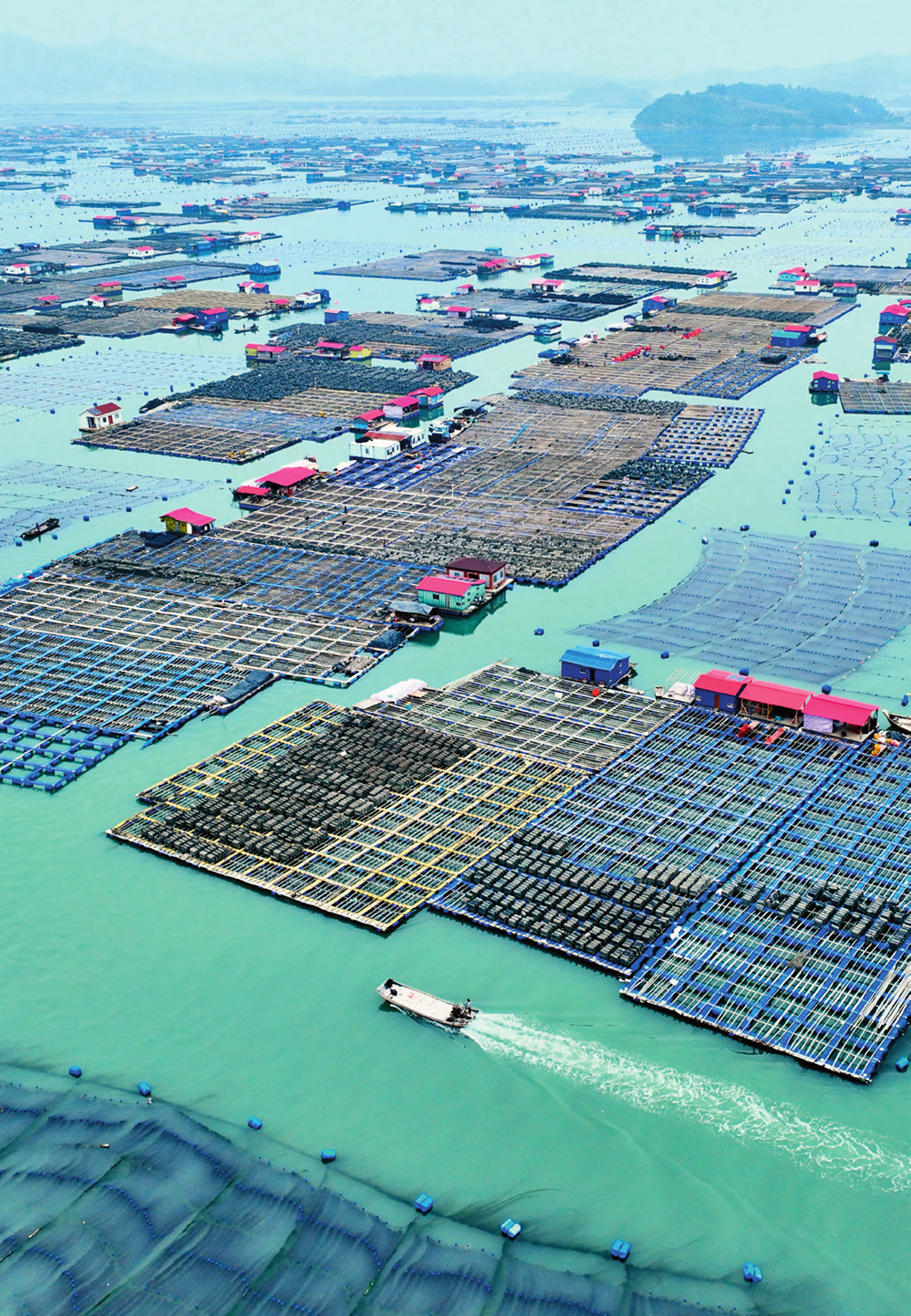晨光洒在海面,万顷碧波间,一列列网箱如同阡陌纵横的海上农田,色泽金黄的大黄鱼悠然欢游,穿梭其间的渔民们徜徉在“金黄色的美梦”中。