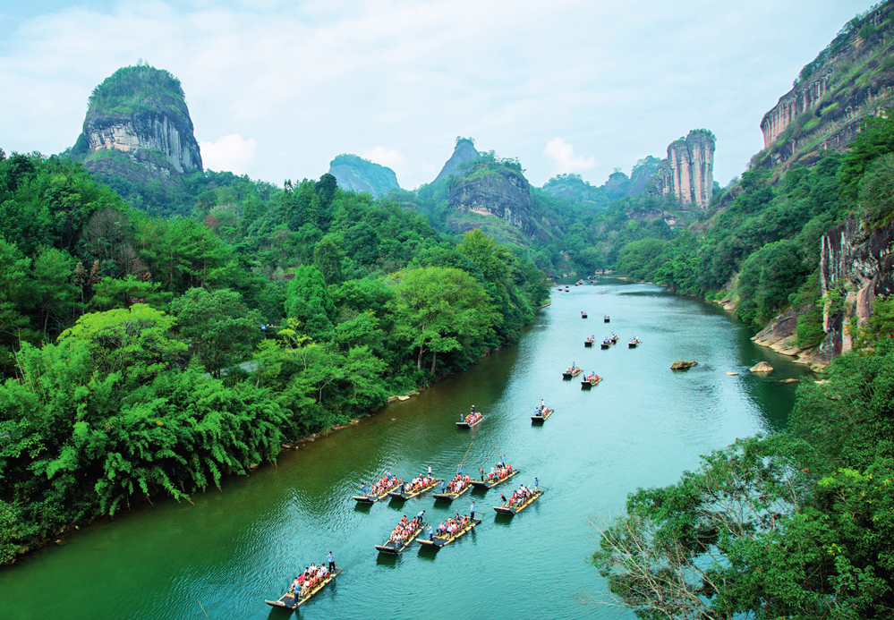 游客在福建省武夷山国家公园九曲溪乘船游览(2023年10月3日摄)陈颖摄/本刊