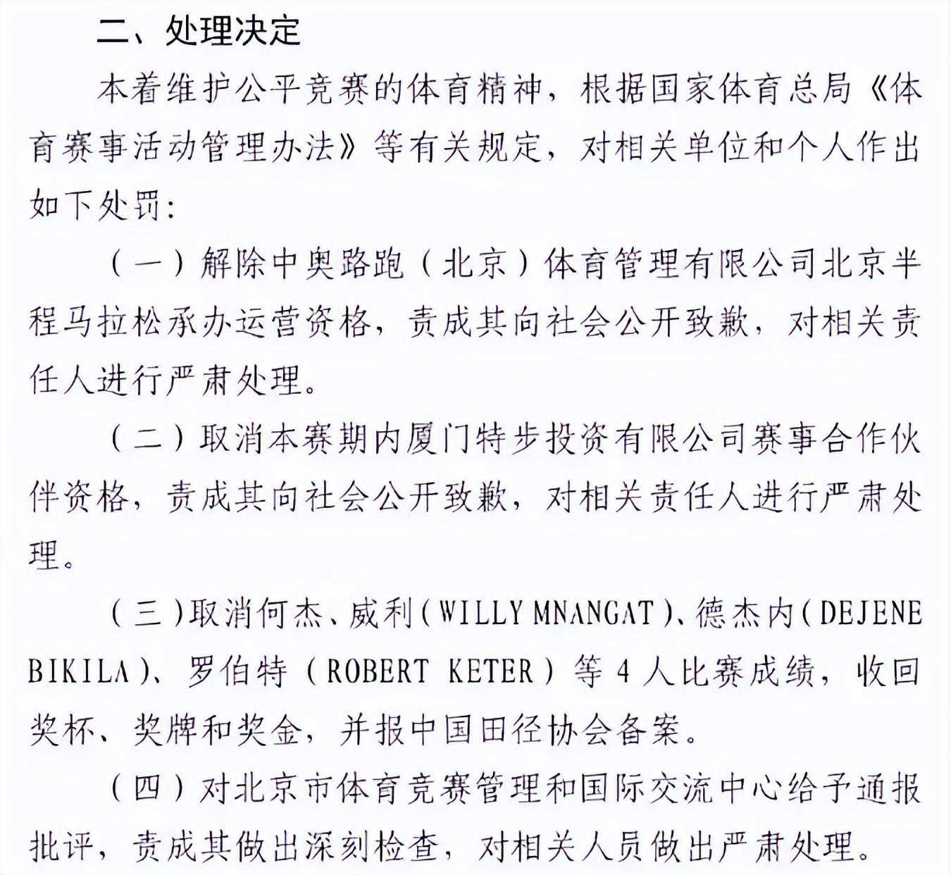 4月19日,北京马拉松赛事官网公布了处理结果:对涉事相关单位和个人进行处罚,取消何杰及外籍选手威利、德杰内、罗伯特等4人比赛成绩,收回奖杯、奖牌和奖金;取消特步赛事合作伙伴资格。
