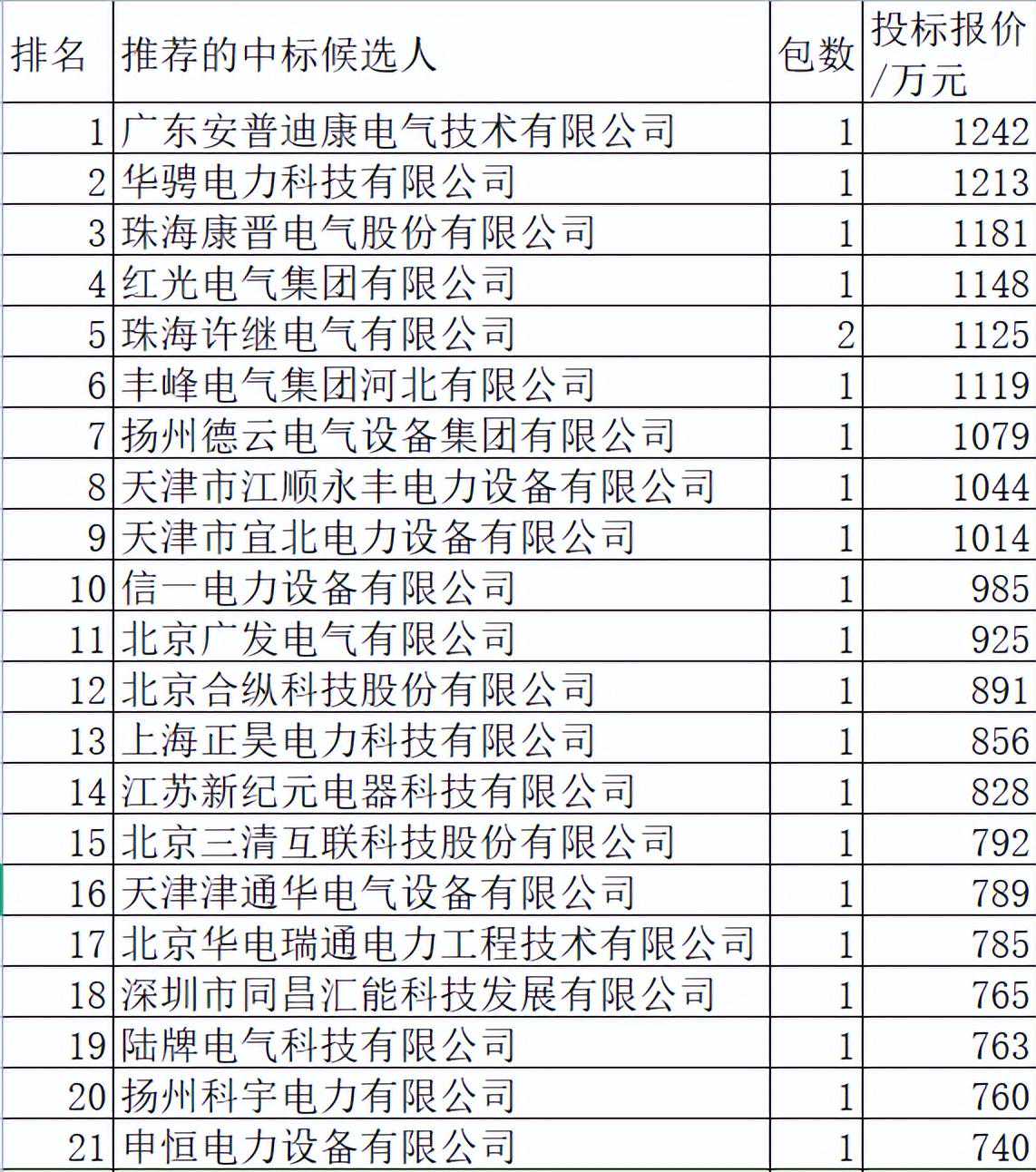 一二次融合环网箱环保气体18包17166万元中标情况为:广东安普迪康电气技术有限公司1242万元、华骋电力科技有限公司1213万元、珠海康晋电气股份有限公司1181万元、红光电气集团有限公司1148万元、丰峰电气集团河北有限公司1119万元、扬州德云电气设备集团有限公司1079万元、天津市江顺永丰电力设备有限公司1044万元、天津市宜北电力设备有限公司1014万元、信一电力设备有限公司985万元、北京广发电气有限公司925万元、北京合纵科技股份有限公司891万元、上海正昊电力科技有限公司856万元、江苏新纪元电器科技有限公司828万元、天津津通华电气设备有限公司789万元、陆牌电气科技有限公司763万元、浙江凌克电气有限公司731万元、北京合锐赛尔电力科技股份有限公司660万元、一能电气有限公司698万元。