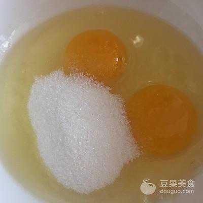 3、鸡蛋两枚,加入白砂糖,用手动打蛋器搅拌砂糖融化