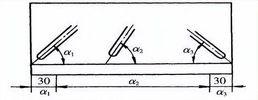 盖面焊焊两道,先焊下面焊道,再焊上面焊道。焊接下面焊道时,电弧要对准根部焊道的下沿,直线运条,焊条角度要大于45°;焊接上面焊道的时候,电弧对准根部焊道上沿,直线运条也可以横向摆动,其焊条角度要<45°,如图所示:
